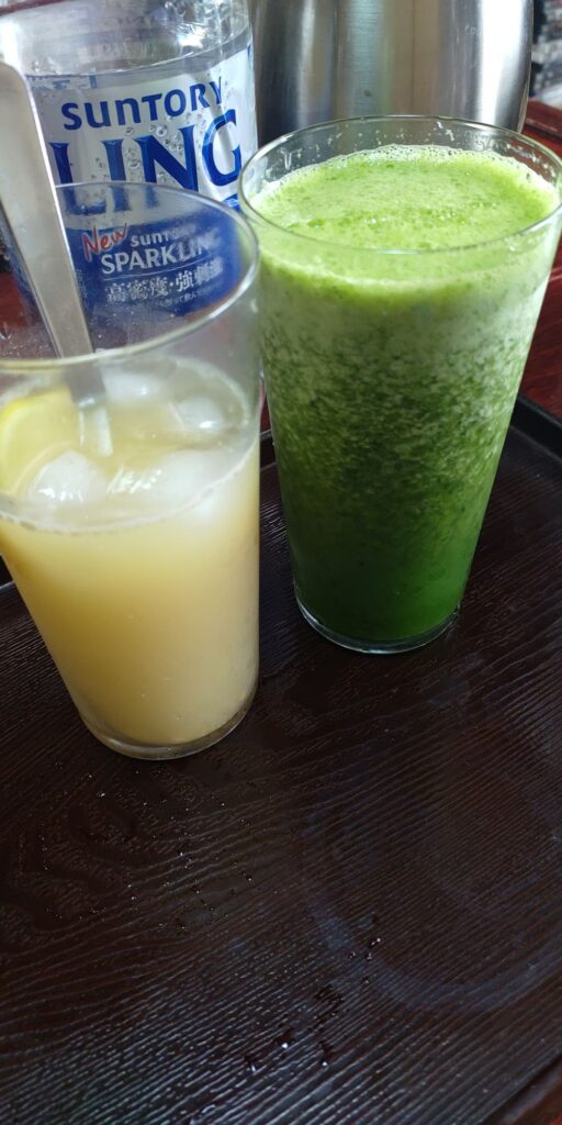 りんご、シャインマスカット3粒、小松菜、モリンガパウダー、にがり