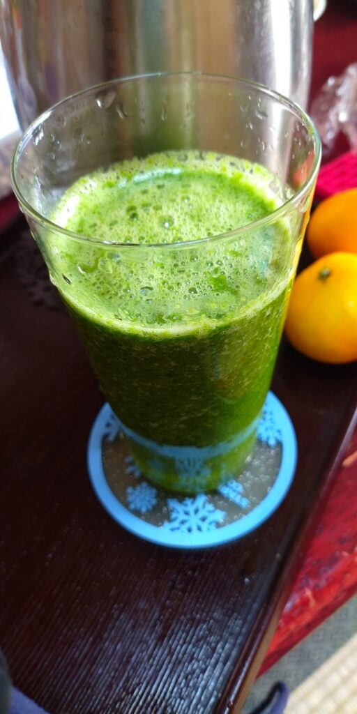 今朝のスムージーは 梨、小松菜、モリンガパウダー、にがり、キウイ